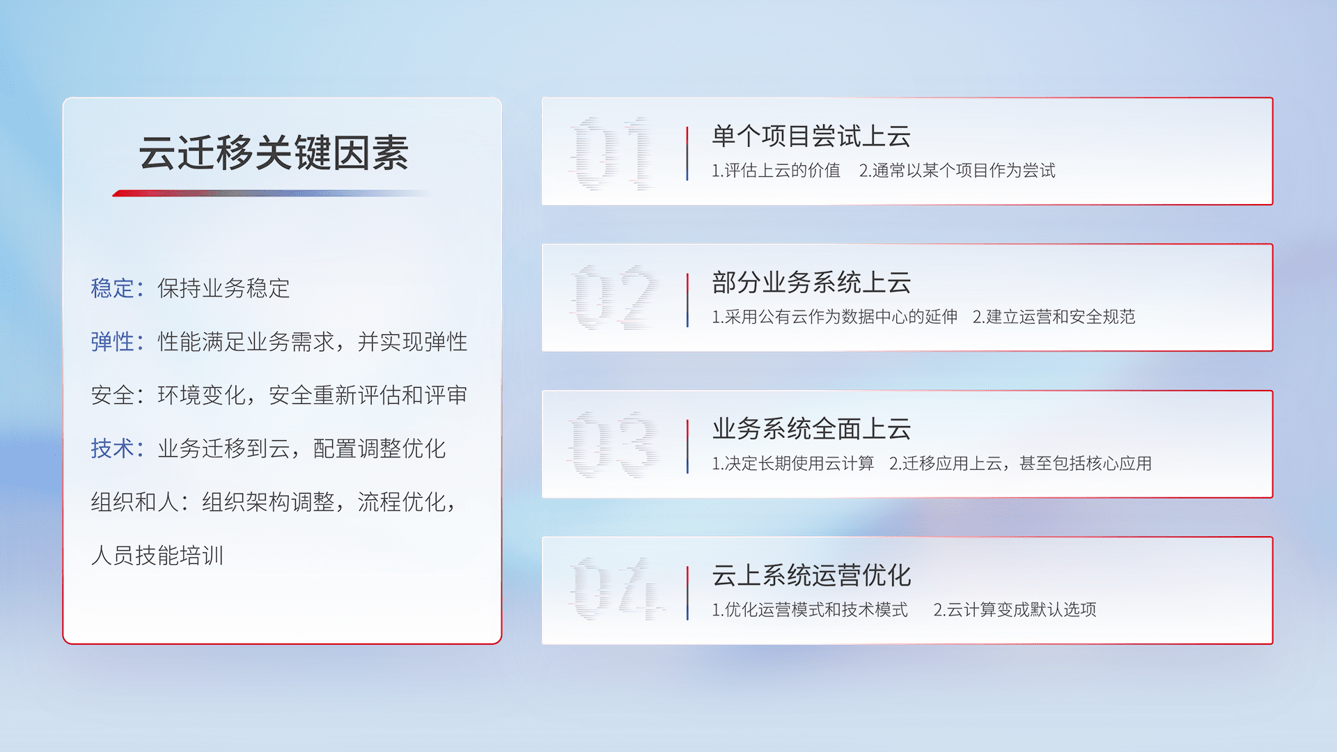 结合实际业务,,,,从规划设计、、、云平台选型、、、、云原生改造、、数据迁移、、、集成交付,,,,迁移全过程为客户识别最佳上云路径,,做好风险识别管理,,设计网络架构、、、身份权限、、、、安全审计合规、、、、操作审计、、、日志审计、、、、监控告警策略、、、、多站点容灾设计等,,对云上基础设施进行整体规划,,,提升IT治理水平,,,以满足弹性、、、、高可用、、、高性能的需求。。