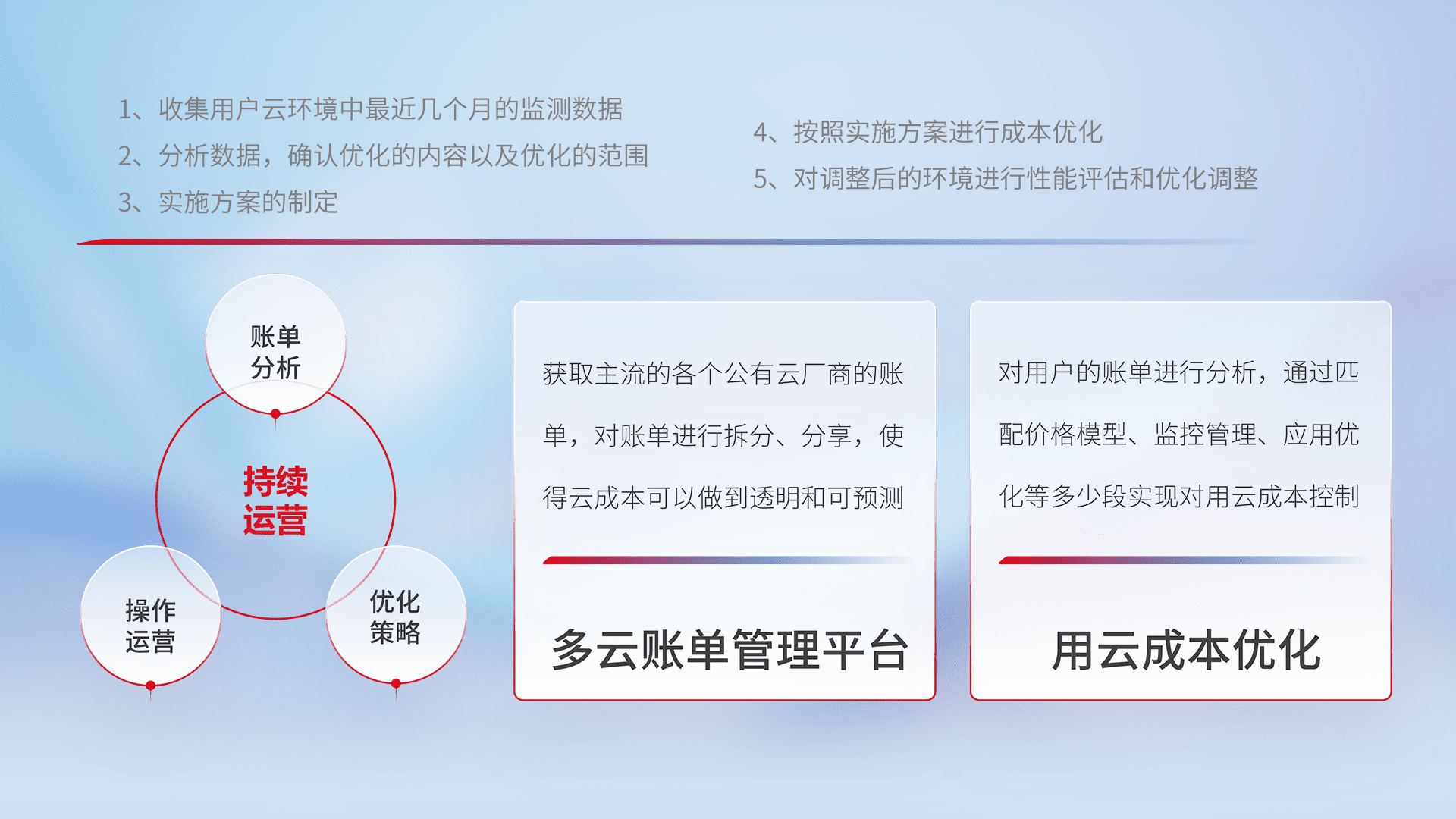 通过多云纳管,,,以统一的资源数据模型把客户的云资源进行抽象和封装,,进而实现对多云资源的统一操作,,,,保障云资源管理的可靠性、、稳定性与可用性。。。量身定制化运维内容,,,配置、、开发运维、、、、补丁管理、、备份、、、、监控、、认证和访问管理、、、、审计和日常巡检等,,,,保障在用云过程中的可靠度,,稳定度以及高可用率。。
